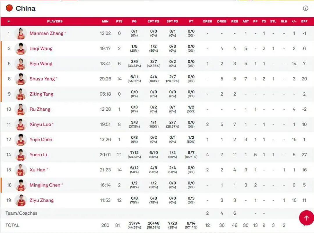 此外,李月汝21分11篮板1助攻1抢断,杨舒予14分5篮板7助攻1抢断,韩旭14分4篮板3助攻1盖帽,张子宇12分3篮板1盖帽,罗欣棫8分7篮板1助攻,王思雨6分3篮板5助攻。