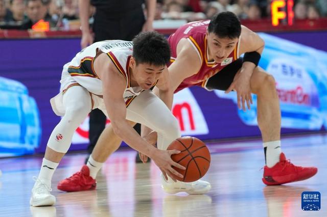 3月11日,吉林长白山恩都里队球员姜伟泽(左)和山西汾酒队球员于米提在比赛中争抢。新华社记者 杨晨光 摄